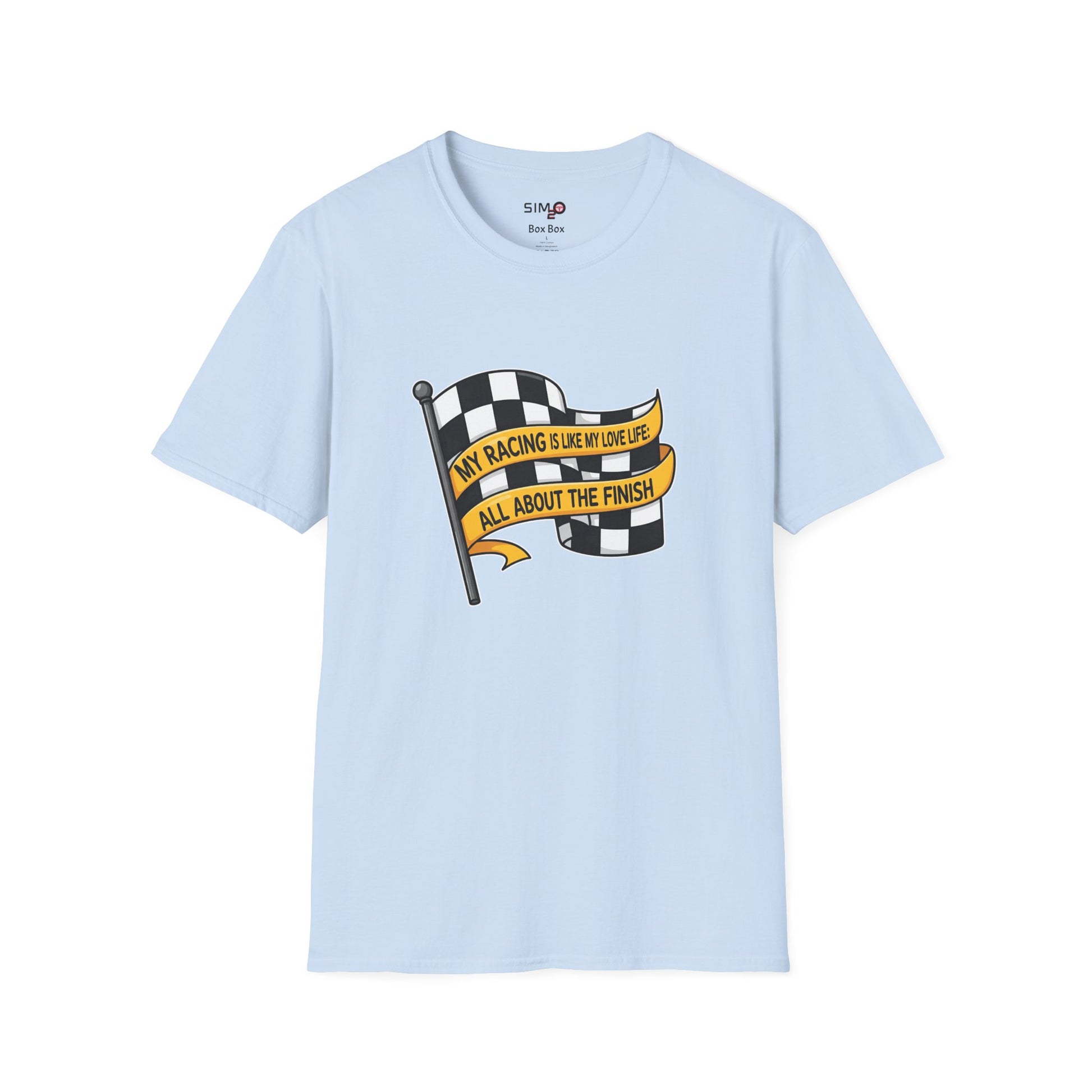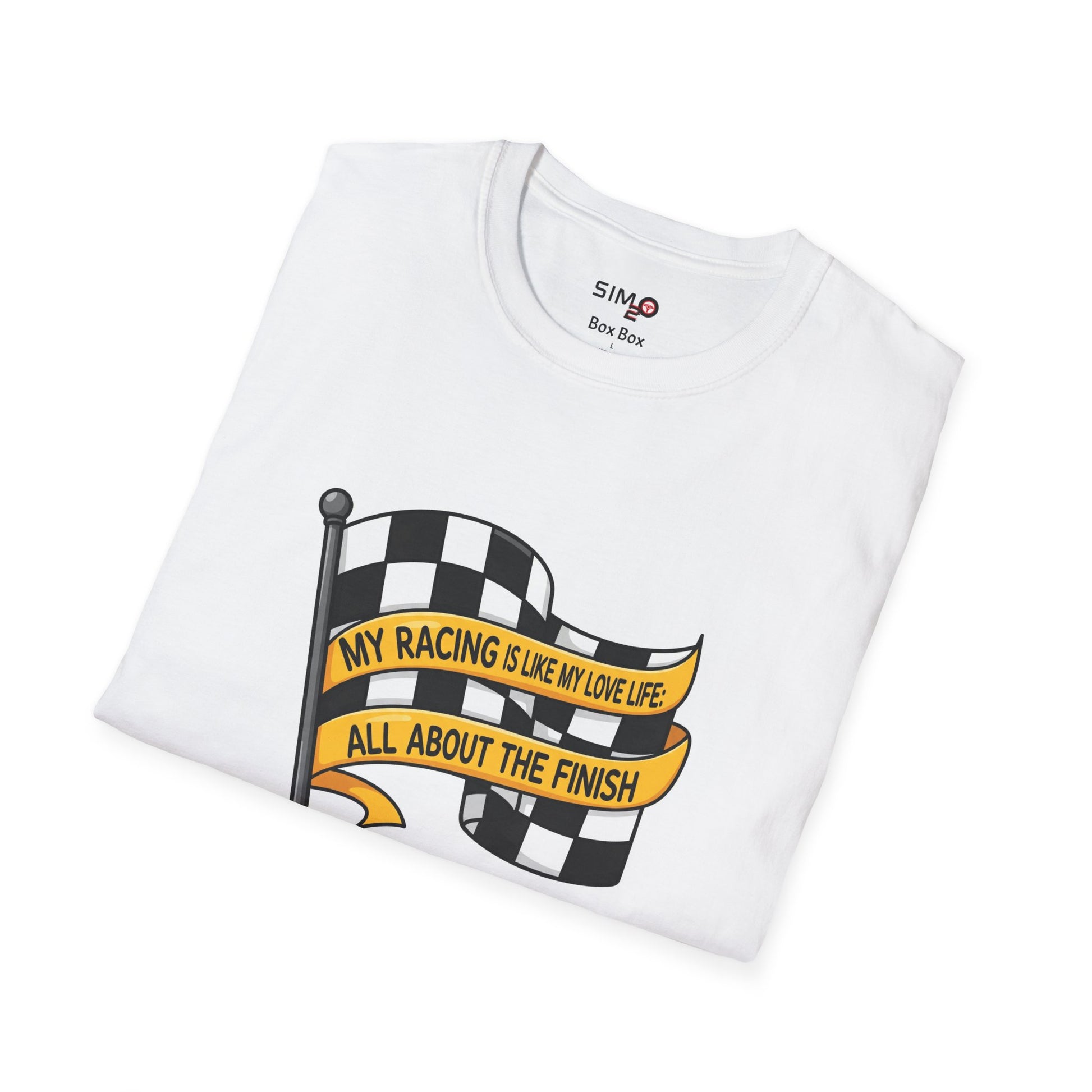 Bold, funny, and a little cheeky — the My Racing Is Like My Love Life: All About the Finish tee is guaranteed to turn heads. Featuring a checkered flag graphic with playful yellow ribbon text, this shirt is the perfect mix of racing pride and humor. Ideal for sim racers who don’t take life too seriously and love a laugh both on and off the track.